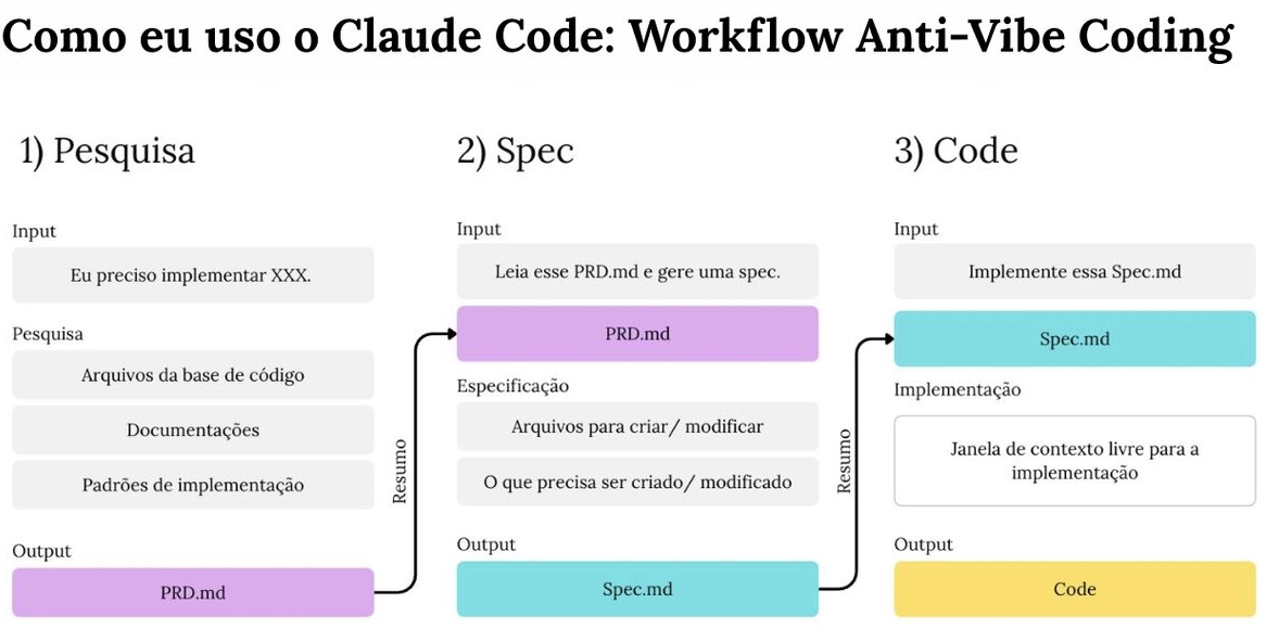Essas três etapas resolvem inúmeros problemas de código gerado por IA (como overengineering, reivenção da roda, implementações erradas e trechos de códigos repetidos) e o ato de limpar a janela de contexto entre uma etapa e outra, ajuda a utilizar a capacidade máxima do modelo, evitando poluir ou sobrecarregar a janela de contexto com infos desnecessárias.